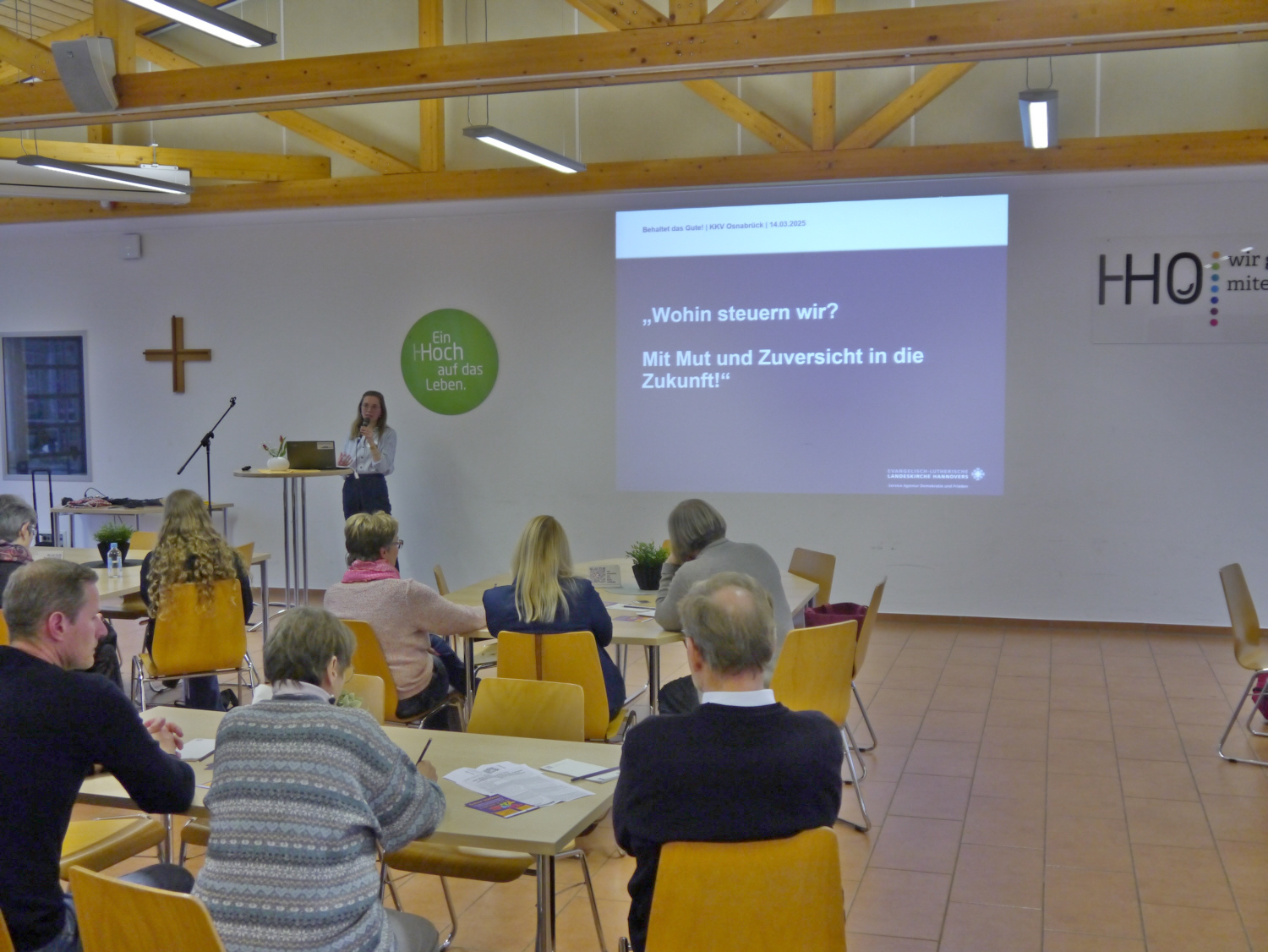 Zur Einführung stellte Maria Sinnemann, Referentin für Demokratiebildung und -förderung in der Service Agentur der Evangelisch-lutherischen Landeskirche Hannovers, die Ergebnisse der 6. Kirchenmitgliedschaftsuntersuchung (KMU VI) zu den Themenbereichen Religiosität, Reformerwartungen und sozialem Zusammenhalt vor. Die KMU ist die größte Studie zur aktuellen Lage der Kirchen in Deutschland und liefert alle zehn Jahre wertvolle Erkenntnisse rund um die Themen Kirchenmitgliedschaft und Religion. 2023 erschien die sechste Ausgabe der KMU. In den letzten 20 Jahren habe die Landeskirche Hannovers rund ein Viertel ihrer Mitglieder verloren, erläuterte Maria Sinnemann die Ausgangslage. „Verantwortlich dafür ist weniger der demografische Wandel, sondern vielmehr die zunehmende Zahl an Kirchenaustritten.“ Trotz dieser wenig erfreulichen Entwicklung bestärkte die Sozialwissenschaftlerin die Kirchenvorsteher*innen darin, notwendige Reformprozesse mutig und zuversichtlich anzugehen. Dabei sei es nötig, sich als religiöse Minderheit anzuerkennen, denn 56 Prozent der Bevölkerung in Deutschland bezeichneten sich laut KMU VI inzwischen als nicht religiös. Weiter ermutigte Maria Sinnemann dazu, den „Markenkern“ der eigenen Kirchengemeinde zu identifizieren und stark zu machen. „Außerdem sollten wir die gesellschaftliche Relevanz von ‚Kirche‘ aufzeigen, stabilisieren und ausbauen.“